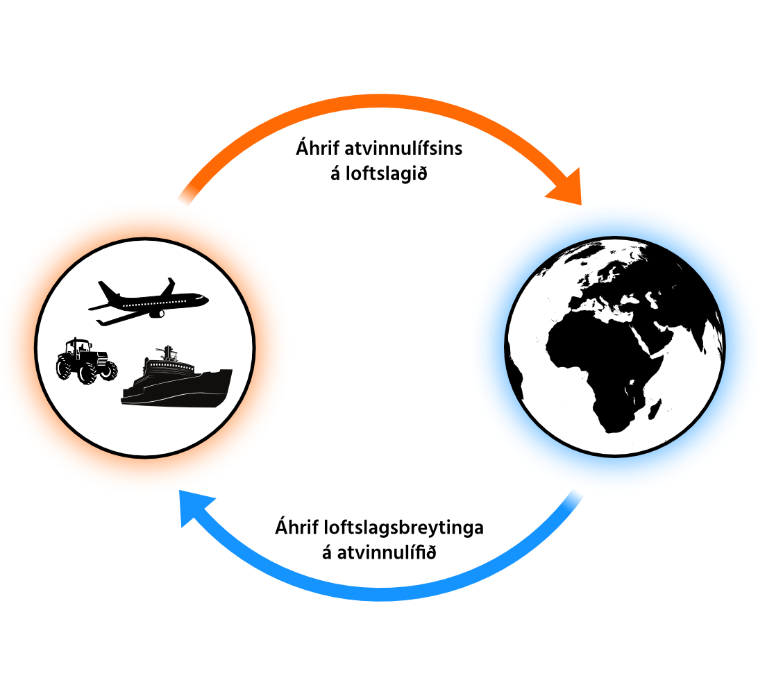Áhrif loftslagsbreytinga á atvinnugreinar geta verið margvísleg og margslungin. Þar má m.a. nefna áhrif á viðskipti og aðfangakeðjur sem ekki má vanmeta. Aukin tíðni hitabylgja, flóða og fellibylja hafa þegar valdið truflunum á framleiðslu í mörgum ólíkum geirum og raskað flutningum og birgðahaldi. Á sama tíma hefur atvinnustarfsemi áhrif á loftslagið, m.a. með nýtingu auðlinda og losun gróðurhúsalofttegunda. Hér á eftir verða þessi tvíhliða áhrif skoðuð fyrir þrjár af meginstoðum íslensks atvinnulífs: sjávarútveg, landbúnað og ferðaþjónustu.